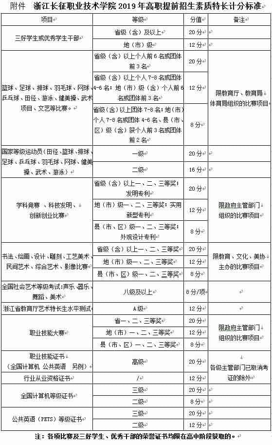 1.高中阶段具有素质特长,符合条件的考生可获得素质特长计分(具体办法见附件《浙江长征职业技术学院2019年素质特长计分标准》),同一考生如符合多项计分条件的,同类项计分只取高分项;不同类项可累计计分,但累计分值最高不超过20分。