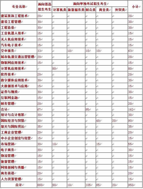 第八条 招生专业、科类及计划。招生专业29个,招生计划950名。面向普高招生考生计划660名,面向单独考试招生考生计划290 名,学制均为三年,具体专业计划如下表: