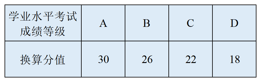 普高招生考生高中学考成绩(满分300分)=各科成绩等级换算分值相加的总和(信息技术与通用技术学考分设的考生,信息技术与通用技术成绩等级换算分值以50%计)。各科成绩等级转换成分数如下表所示: