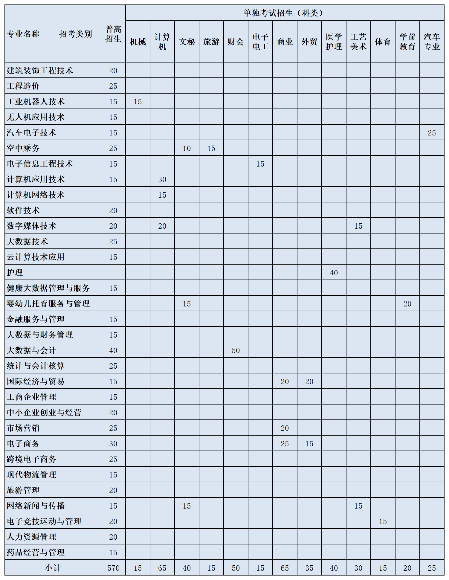 第八条 招生专业、科类及计划。招生专业32个,招生计划1000名。其中面向普高招生考生计划570名,面向单独考试招生考生计划430名,学制均为三年,具体专业计划如下表: